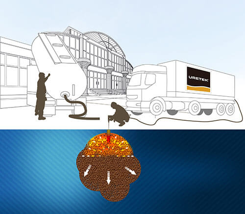 4) Injection de la résine au sein des billes d’argile expansée. En fonction du projet, la résine peut être injectée dans tout le volume de la cavité de manière à saturer les billes d’argile ou simplement en partie haute (intrados) pour réaliser un clavage et une mise en compression.