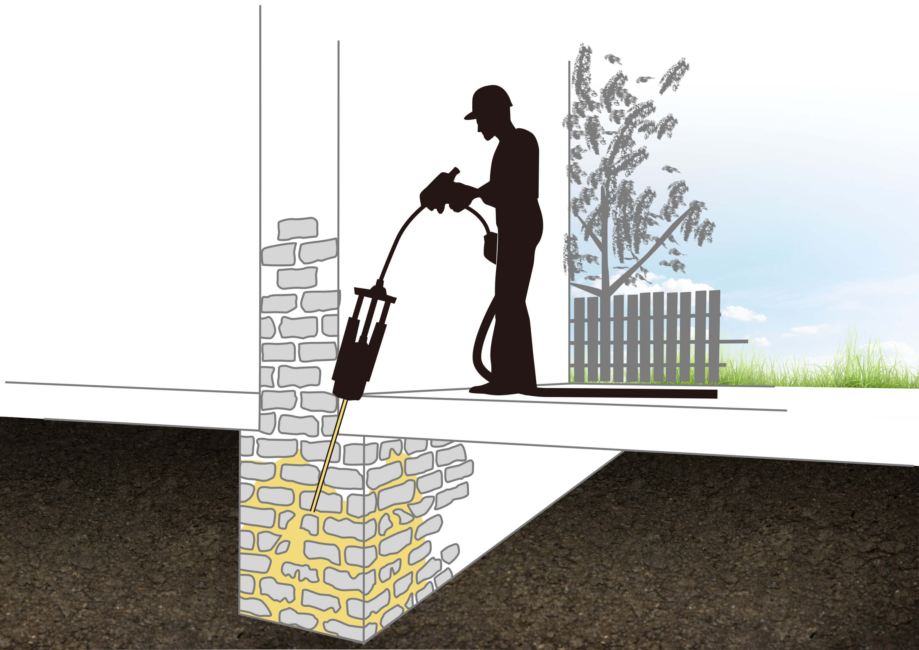 1) Perforation de la maçonnerie à traiter et insertion des tubes d’injection.