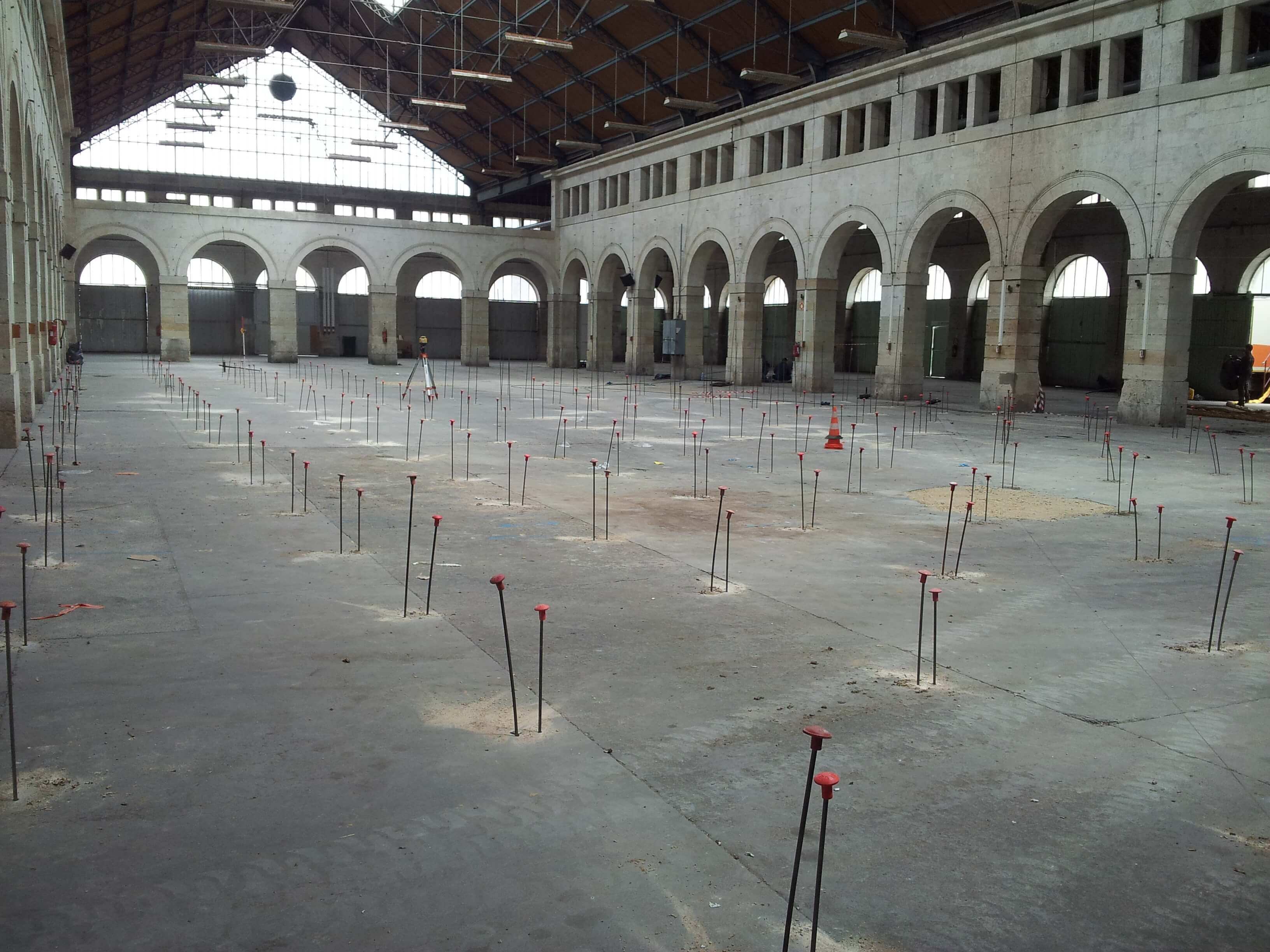 La dalle existante a été démolie après la stabilisation des remblais par l'injections URETEK® pour être remplacée par une dalle en BA. Cette prestation faisait partie du programme de la rénovation de la halle.