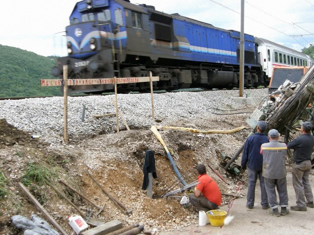 Afin de mettre en place un gazoduc à travers le remblai, un tunnel de 65 cm de diamètre a été exécuté par forage sous-terrain, à l'aide de la technologie HDD (Horizontal Directional Drilling). Pendant l'insertion de la canalisation, un glissement a été observé sous le chemin de fer provoquant le blocage de tout l'équipement. L'état de contrainte dans le remblai a entrainé, localement, d'importantes déformations se traduisant par un tassement continu de l'ordre de 5cm/semaine. Celui-ci a dû être fréquemment compensé avec de nouveaux apports de pierre.
