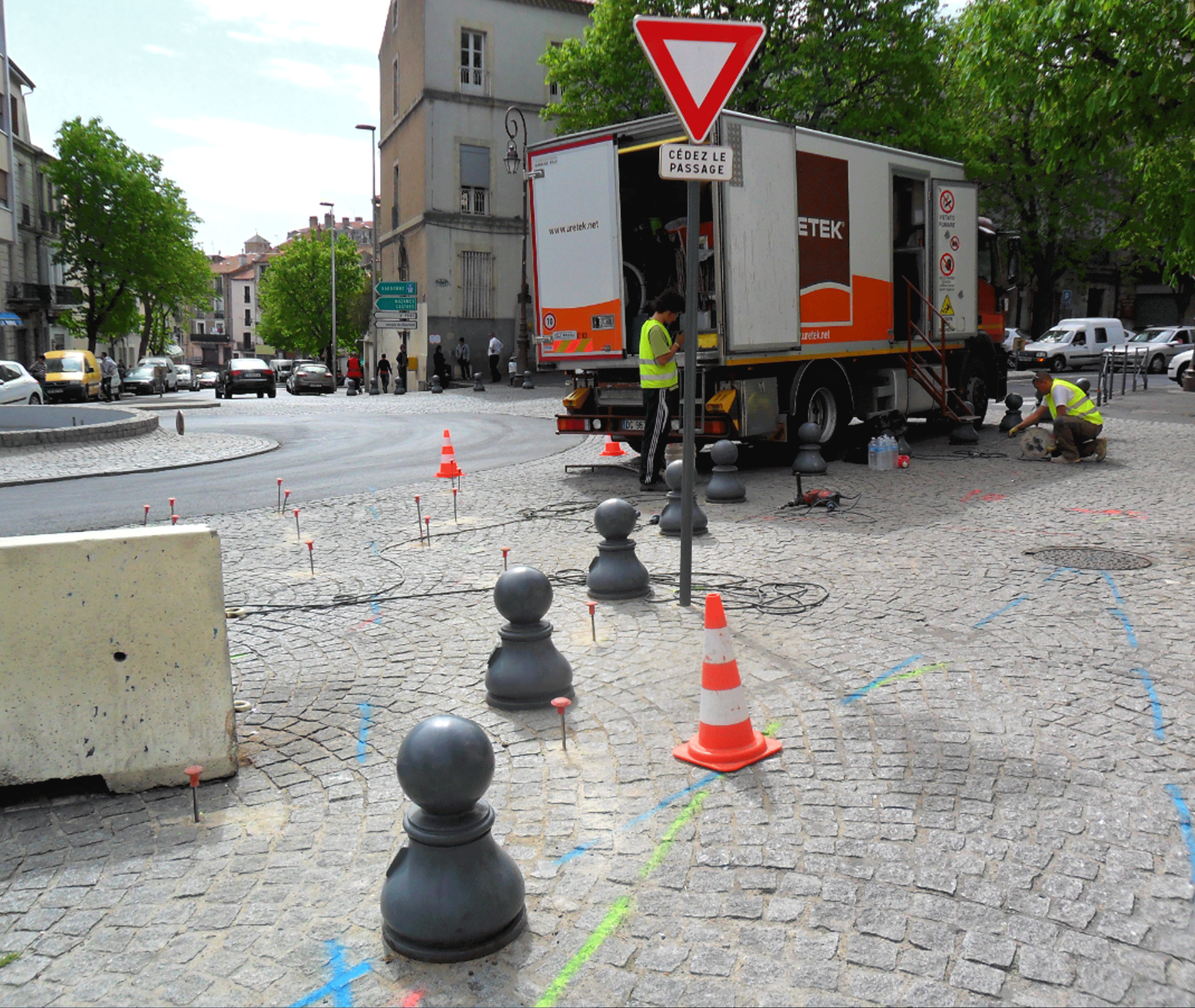 La réussite d’un tel chantier tient tout d’abord à un repérage très précis de l’ensemble des réseaux (AEP, EU, électriques, gaz, éclairage public, alimentation de la fontaine…). L’ensemble des réseaux a été implanté par les concessionnaires puis une société privée est intervenue afin de contrôler une 2ème fois l’ensemble des réseaux. Ainsi, un maillage précis a pu être appliqué de manière à obtenir un traitement le plus homogène possible. Toute l’intervention s’est déroulée sous contrôle permanent laser. Après intervention, les essais pénétrométriques ont prouvé que les objectifs de portance pour la couche de forme avaient bien été atteints.